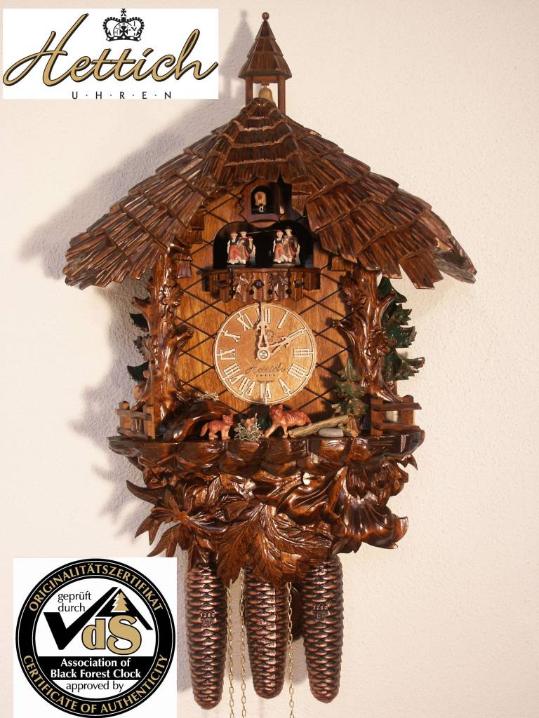 Hettich Uhren Pendule à coucou artisanale originale dans la Forêt-Noire avec des figures et des sculptures artisanales de 47 cm de haut et 40 cm de large - Copie