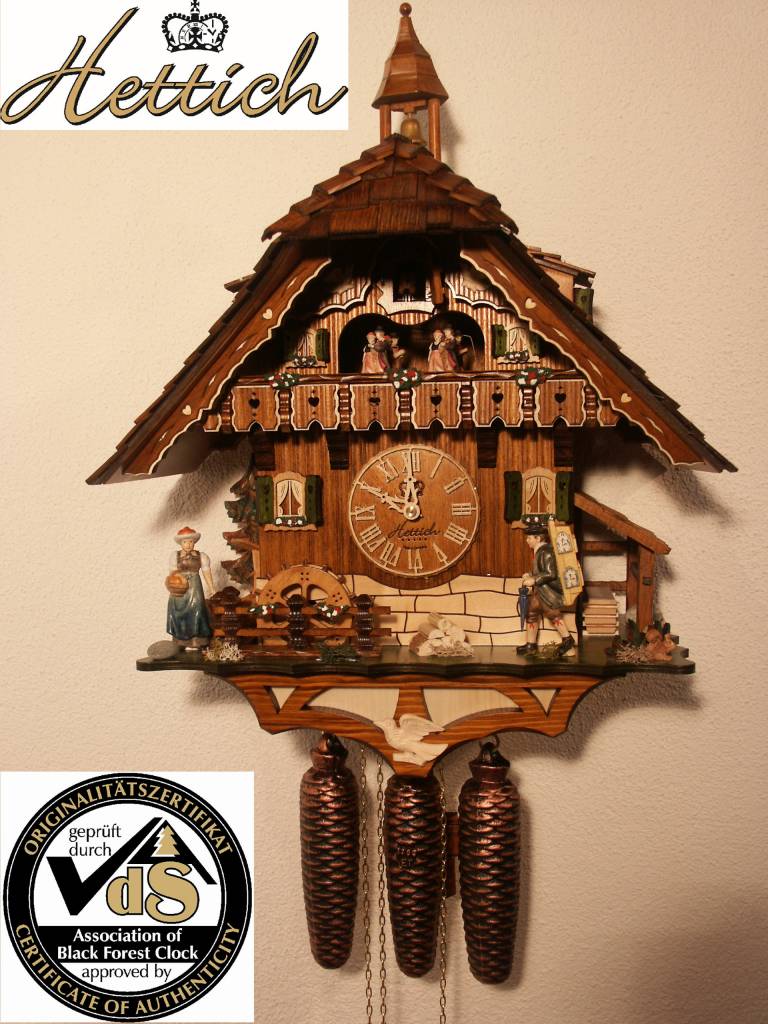 Hettich Uhren Horloge coucou originale, fabriquée à la main dans la Forêt-Noire, style maison de la Forêt-Noire, 47 cm de haut avec support d'horloge mobile - figures de danse et roue de moulin